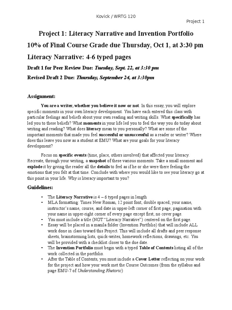 ENC Traditional Literacy Narrative Assignment Sheet At A Glance. Assignment. One of your major course assignments is to prepare an autobiographical literacy narrative that specifically Writing Strategies. As your Allyn and Bacon text suggests, good writing begins with good questions. Why do · A literacy narrative uses the elements of story (plot, character, setting, conflict) to recount a writer’s personal experience with language in all its forms—reading and writing, acquiring a second language, being an insider or outsider based on literacy level, and so on. Your narrative should focus on a single incident or event. You might explore a positive or negative 12 rows · Assignment: Literacy Narrative For this activity, you will create a Literacy Narrative,